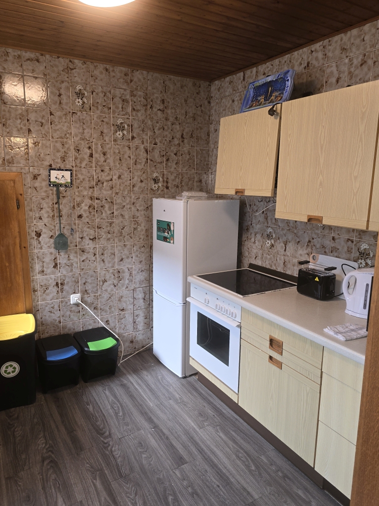 Komplett ausgestattet mit 2 Kühlschränke, Herd, Mikrowelle, Backofen, Geschirr und Besteck und Kochutensilien